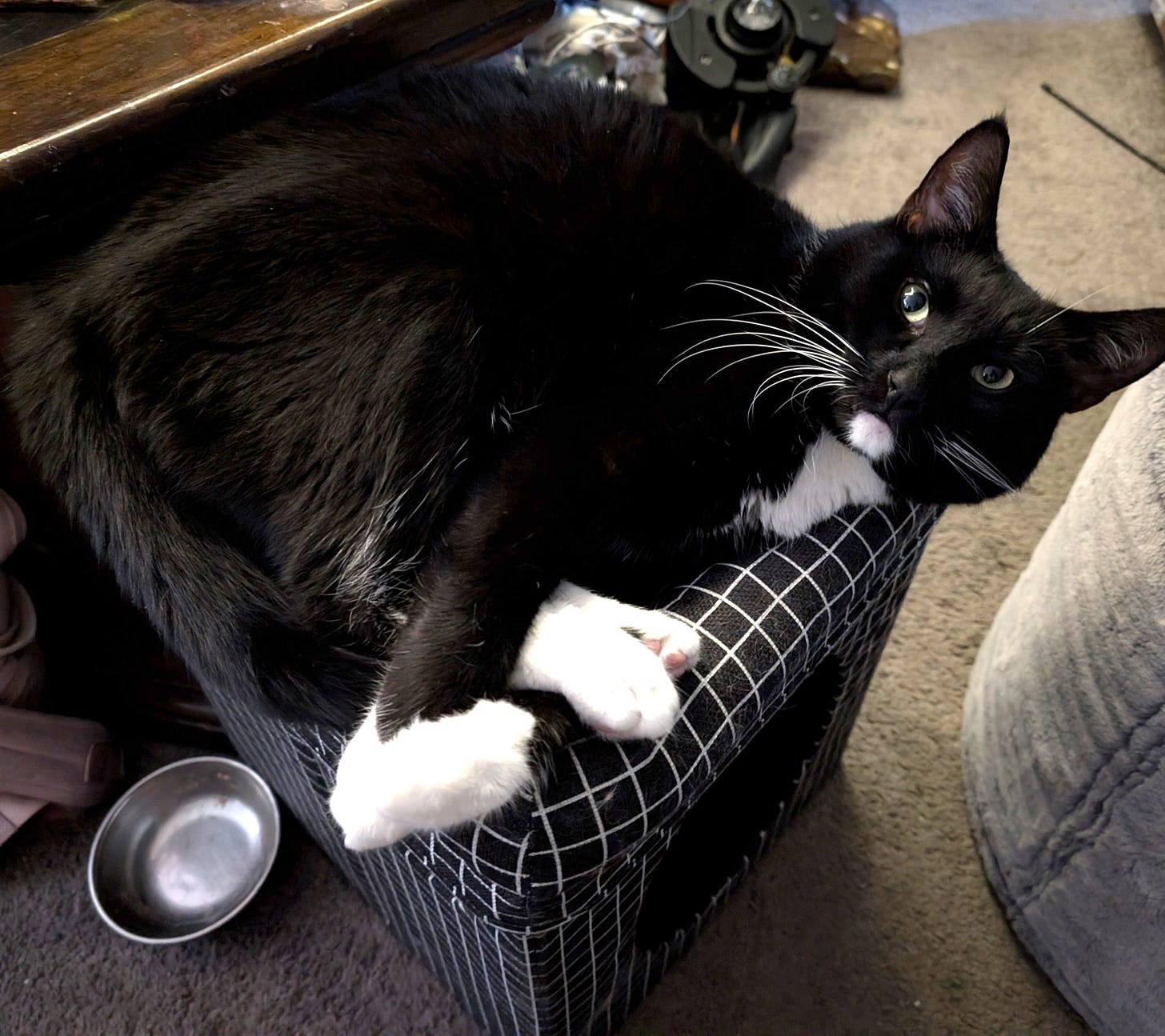 Jayne is a little too big to fit in this comfy square… but that won’t stop him from trying