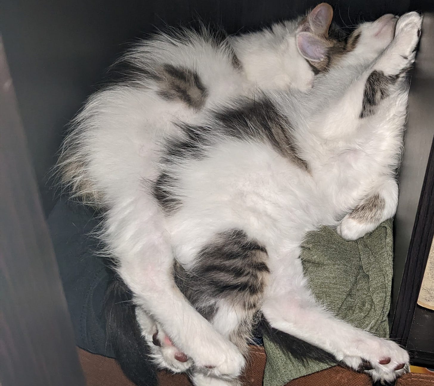 Zoro is a little too big to fit in these cubbies now, but Sanji still fits. They don’t really lay in there anymore, though. I use to throw my shirts in there for them to lay on, I wonder if they would again if I started tossing my used shirts in there again.